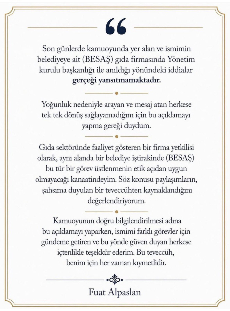 Aplaslan kamuoyuna yaptığı yazılı açıklamayla söz konusu haberleri yalanladı. Alpaslan, aynı sektörde faaliyet gösterdiği bir belediye iştirakinde görev almasının etik olmayacağını vurguladı.