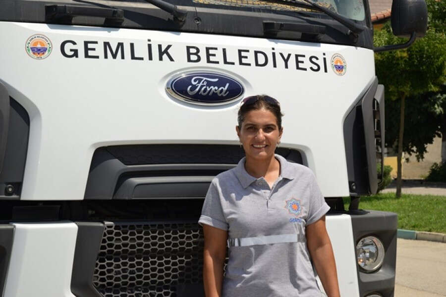 Bursa'nın Gemlik ilçesinde, belediyenin ilk kadın ağır vasıta şoförü direksiyon başında hizmet vermeye başladı.