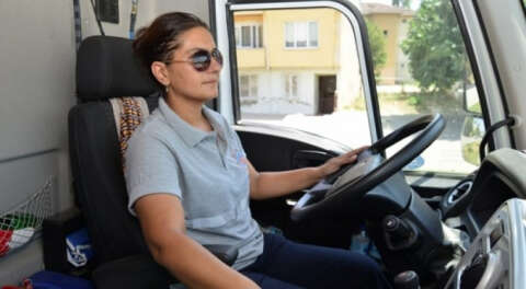 Gemlik Belediyesi Park ve Bahçeler Müdürlüğünde ağır vasıta şoförü olarak görevlendirilen Sevda Yaruk (35), direksiyon başında baba mesleğini sürdürüyor.
