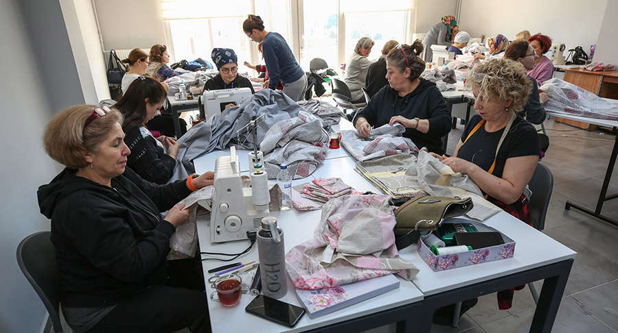 Herkes deprem bölgesindeki ihtiyaçların karşılanması için canla başla çalışırken Nilüfer Belediyesi Sürekli Mesleki Eğitim Merkezi’nin kursiyer kadınları ve öğretmenleri de yaralara merhem olabilmek için dikiş makinalarının başına geçti. NİLSEM kursiyerleri deprem bölgesine gönderilmek için şimdiye kadar 150 nevresim takımı ve battaniye dikti. Kursiyerler ihtiyaç oldukça çalışmalarını sürdürecek.