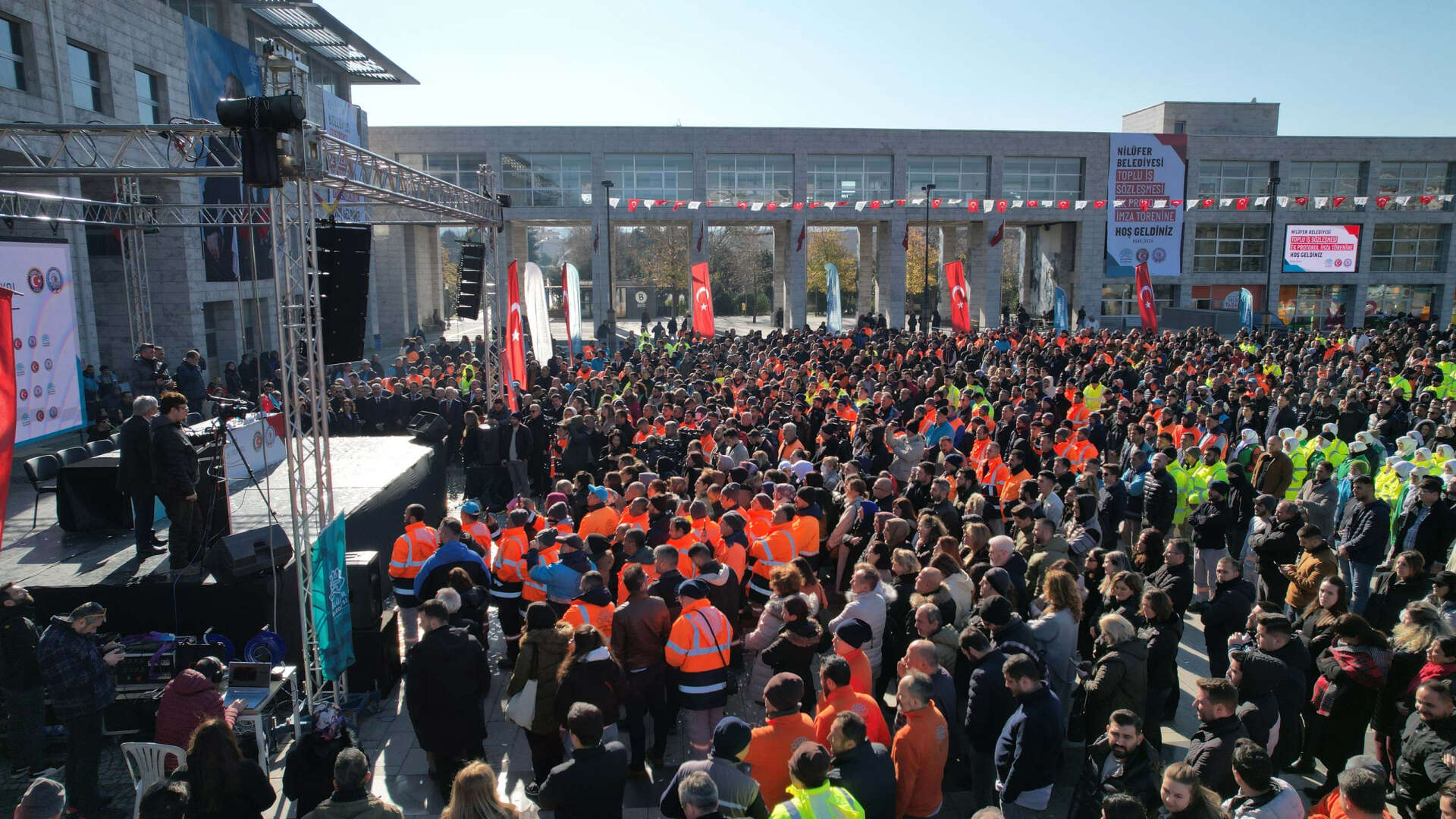 Nilüfer Belediye Başkanı Turgay Erdem, Toplu İş Sözleşmesi Ek Protokolü imza töreniyle iyileştirme haberini paylaştı. Tören, Nilüfer Cumhuriyet Meydanı’nda düzenlendi. CHP Genel Başkan Yardımcısı ve Parti Meclisi Üyesi Gamze Taşçıer, CHP Bursa Milletvekilleri Nurhayat Altaca Kayışoğlu, Hasan Öztürk ve Orhan Sarıbal, CHP Bursa İl Başkanı Nihat Yeşiltaş, CHP Nilüfer İlçe Başkanı Özgür Şahin ile Belediye-İş Sendikası Genel Başkanı Nihat Yurdakul ve Bursa Şube Başkanı Orhan Çelik de törene katıldı. Erdem, ek protokolün detaylarını paylaştı. Çalışanlara seslenen Erdem, “Çalışma arkadaşlarımızın bu töreni bir süredir heyecanla beklediklerini biliyorum. Haklılar, çünkü ülkemizin içinde bulunduğu ekonomik durum ortada. Maaşlar sabitken, bir şeyin fiyatı 2 gün üst üste aynı kalamıyor” diye konuştu.