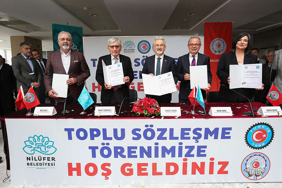 Konuşmaların ardından Nilüfer Belediye Başkanı Turgay Erdem ve Belediye-İş Sendikası Genel Başkanı Nihat Yurdakul toplu sözleşmeleri imzaladı.