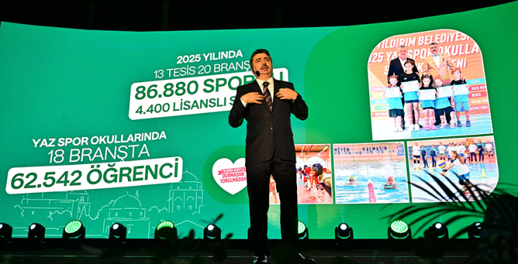 Yıldırım tüm kimliklerinin yanında bir de spor kentidir. Yıldırım’da 7’den 77’ye herkesin spor imkanına sahip olmasını istiyoruz ve bu doğrultuda çalışıyoruz. Sadece 2025 yılında, 13 tesis 20 farklı branşta 86 bin 880 vatandaşımıza spor hizmeti verdik. Yaz spor okullarında 62 binden fazla çocuğumuza spor eğitim hizmeti sağladık. Bugün Yıldırım’daki spor tesislerimiz tüm Bursa’ya hizmet vermektedir. Spora verdiğimiz destek ve yatırımlarımızın meyvelerini de alıyoruz. Bugüne kadar 129 ulusal ve uluslararası organizasyona ev sahipliği yaptık. Sporcularımız 186 Türkiye derecesi, 5 dünya derecesi, 35 Avrupa- Balkan derecesi- 35 farklı uluslararası derece ve yüzlerce bölge ve Bursa derecesi elde etti."