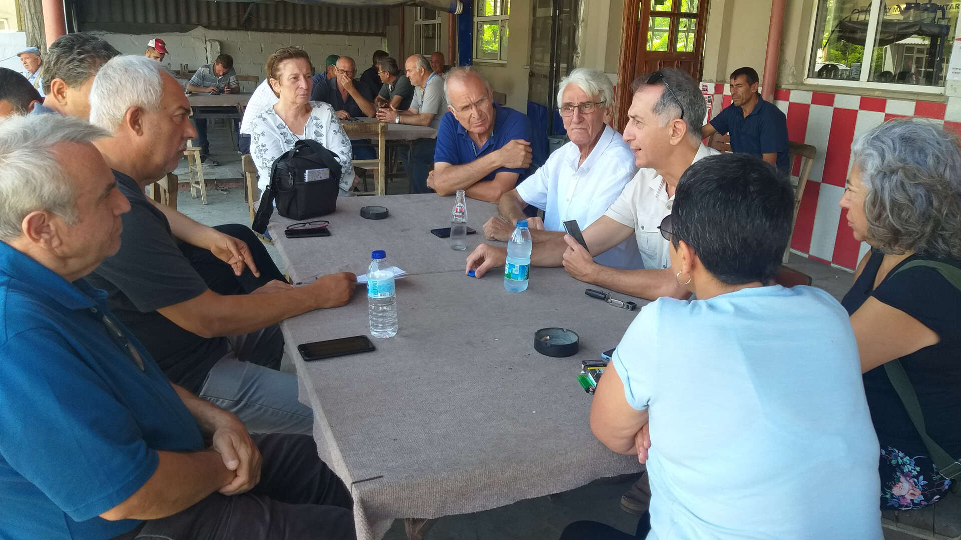 Kolektif, daha sonra Karacabey ilçesi Bakırköy’de köy muhtarı ve vatandaşlarla bir araya geldi. Köy kahvesinde yapılan sohbette tarla sahipleri borlu suyla sulanan ürünlerin yandığını anlattı.