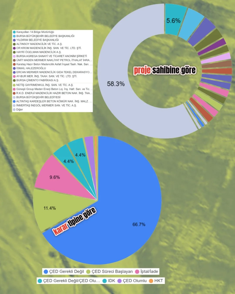 ÇED süreçleri de dikkat çekiyor. Satılan ihalelerden 6’sı için ÇED süreci yürütüldü; 4’üne “ÇED gerekli değil” kararı verilirken, 2’sinde süreç devam ediyor. Gemlik’te Bursa Çimento’nun marn ocağı için başlattığı ÇED süreci sürerken, Karacabey’de ormanlık alanda kalker ocağı için “ÇED gerekli değil” kararı alındı.