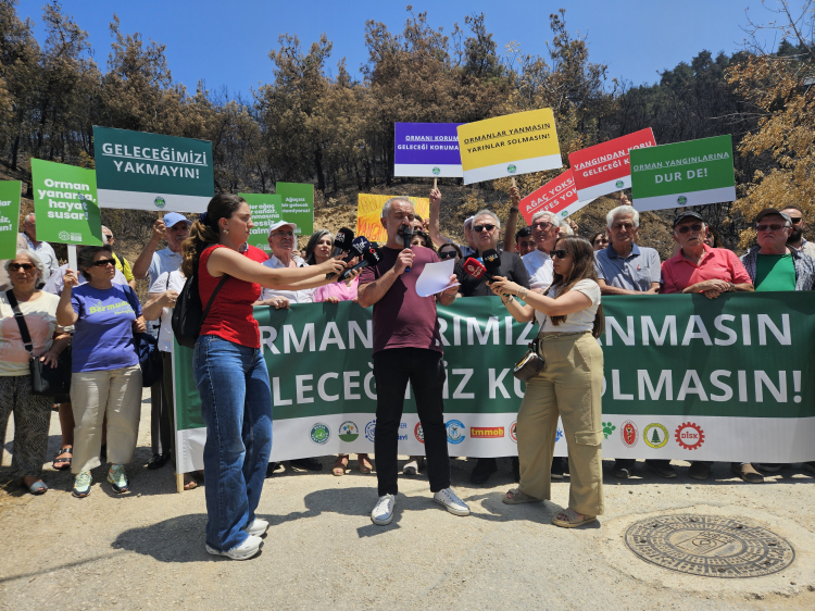 Tarım Orkam Sen Bursa Şube Başkanı Tarık Efe basın açıklamasını okudu. Efe, OGM yangın istatistiklerine göre ülkemizde son 88 yılda toplam 1.907.000 hektar orman alanının yandığını, yanan alanların yıllık ortalamasının 21.600 hektar olduğunu, 88 yılda çıkan yangın adedinin 126.000 adet olup yıllık ortalamasının 1.400 adet olduğu bilgisini paylaştı. Efe, 2024 yılında rekor kırarak 3.800 adet olduğunu belirterek, "Yangınların artışı küresel iklim değişikliğinin yanında her yıl verilen maden izinleri, maden sahalarında çalışan işçilerin yangın kültürünün olmaması gibi nedenler, asıl sorunların göz ardı edilmesi ve yükümlülüklerin hafife alınmasıyla olmaktadır. Yangınla ilgili güncel yasal düzenlemelerin yapılması, bu eylemlerin atlatılmadan ve geliştirilerek tamamlanması büyük önem arz etmektedir. Yangınlarla sadece mücadele odaklı stratejiler yerine ağırlıklı olarak halkın katılımı ile çok daha ekonomik, risksiz yangınların çıkmamasına yönelik, yeni başlamış yangınlara ise anında kaynağında güvenli ve etkili olarak müdahale yangınların ilacı olacaktır. Yangın afetlerini en aza indirmek için insan odaklı projeler geliştirilmesi zorunludur. Yangınları kaynağında önlemek amacıyla yangına hassas bölgelerden başlamak üzere tüm yaşam alanlarında yangınlara her anlamda hazırlıklı, doğaya ve yangınlara duyarlı çevre sorunlarını sahiplenmiş, gerekli olabilecek hemen her konuda eğitilmiş, organize olmuş, gerektiğinde yeni başlamış yangınlara hemen müdahale edilebilecek yangınla mücadele kültürünün geliştirilmesi gerekmektedir" ifadelerini kullandı.