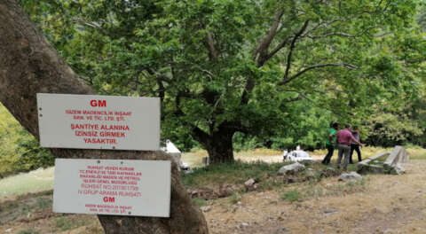 Gizem Madencilik Şirketi'nin maden sahası girişinde yan yana bulunan asırlık iki anıt çınar ağacının gövdesine tabelalarını çakarak çevreye şimdiden zarar verdikleri görüldü.