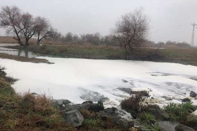 Bursa'nın Mustafakemalpaşa ilçesinde, Uluabat Gölü'ne bağlantısı bulunan bir sulama kanalında oluşan beyaz renkteki köpüklenmenin nedeni araştırılıyor.