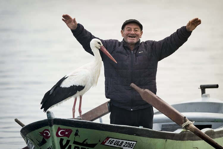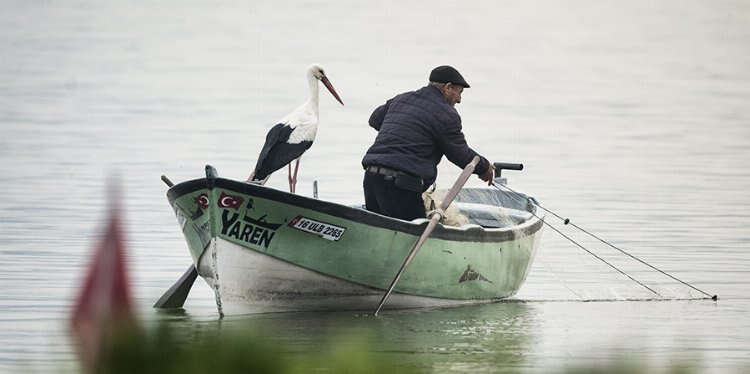 Yaren leyleğin, göl manzaralı yuvasının bulunduğu mahallede balıkçı Yılmaz'ın kayığındaki "geleneksel" pozu, doğa ve yaban hayatı fotoğrafçısı Alper Tüydeş tarafından kayda alındı.