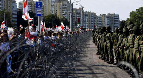 Belarus'ta cumhurbaşkanlığı seçim sonuçlarını protesto etmek için Cumhurbaşkanlığı Sarayı'na yürümek isteyen göstericileri polis engelledi.