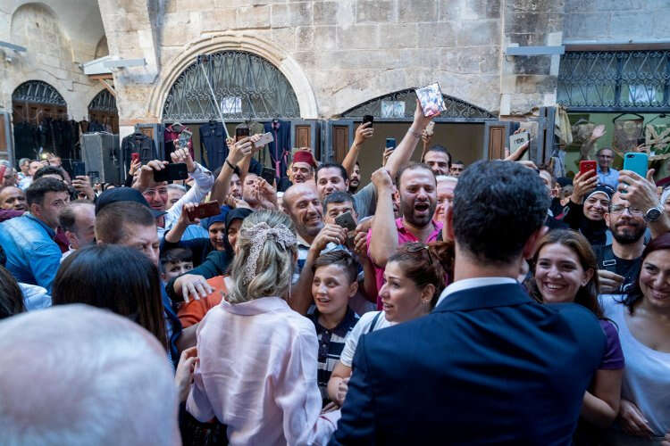 Pazarı gezerek yeni faaliyete giren dükkanlarda dolaşan Esad, esnaf ve Halep sakinleriyle sohbet etti. Suriye'de en önemli tarihi İslam eserlerinden biri olan Emevi Camii'ni de ziyaret eden Esad ailesi, caminin restorasyonu hakkında yetkililerden bilgi aldı. Halep'te Esad ailesini karşılayan Suriyeliler, sevgi gösterilerinde bulundu.
