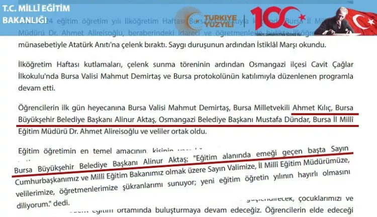 Geçmişte eğitim-öğretim yılı açılış törenlerine katılan AK Partili Bursa Büyükşehir ve Osmangazi belediye başkanlarının, milletvekillerinin adlarını açıkça yazan İl Milli Eğitim Müdürlüğü, bu yılki törene katılan CHP’li Büyükşehir Belediye Başkanı Mustafa Bozbey ve Osmangazi Belediye Başkanı Erkan Aydın’ın adına haber bülteninde hiç yer vermedi.