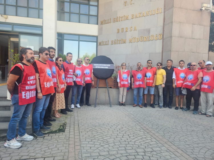 Saat 13.00'de Bursa Milli Eğitim Müdürlüğü önünde bir araya gelen eğitimciler açıklamanın ardından Milli Eğitim yetkililerini protesto ederek, siyah çelenk bıraktı.