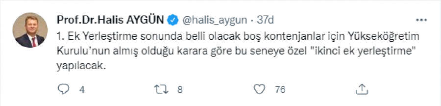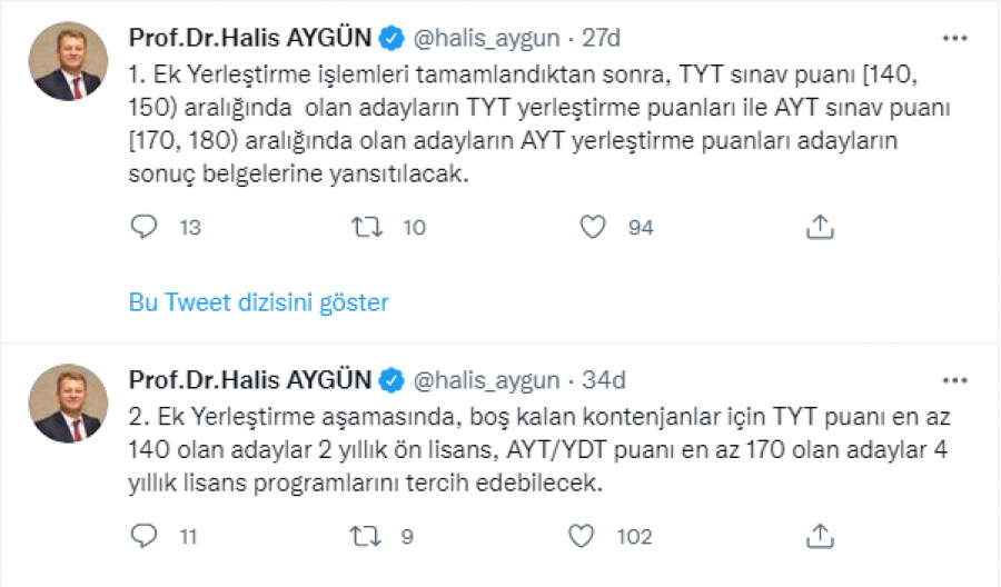 ÖSYM Başkanı Prof. Dr. Halis Aygün Twitter hesabından yaptığı açıklamada, bu yıl Yükseköğretim Kurumları Sınavına girenlere ek iki yerleştirme yapılacağını açıkladı.