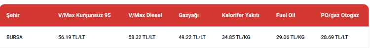 Bursa'daki son akaryakıt fiyatları şöyle: