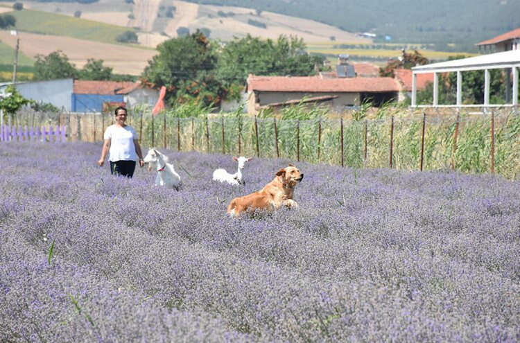 Lavanta yetiştirirken ilaçtan uzak durmayı tercih eden Ersoy ve Nilüfer Şahin, bahçedeki yabancı otla mücadeleyi de "ot avcısı" olarak tanımladıkları iki keçiyle yürütüyor.