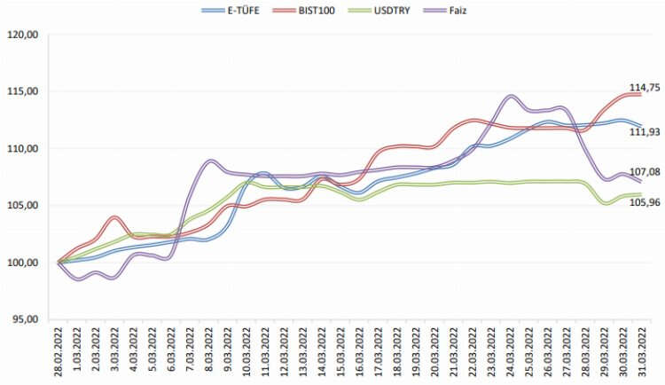 ENAGrup Tüketici Fiyat Endeksi (E-TÜFE) seyri günlük bazda BIST100, ABD Doları döviz kuru ve Faiz oranı (2 yıllık devlet tahvili) göstergelerinin günlük verileri şöyle: