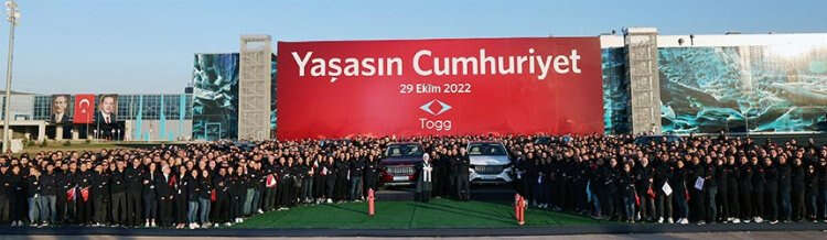 Hatıra fotoğrafı çekimi, "Yaşasın Cumhuriyet" yazılı zemin önünde gerçekleştirilirken, alanda farklı renklerde 6 Togg aracı dikkati çekti.