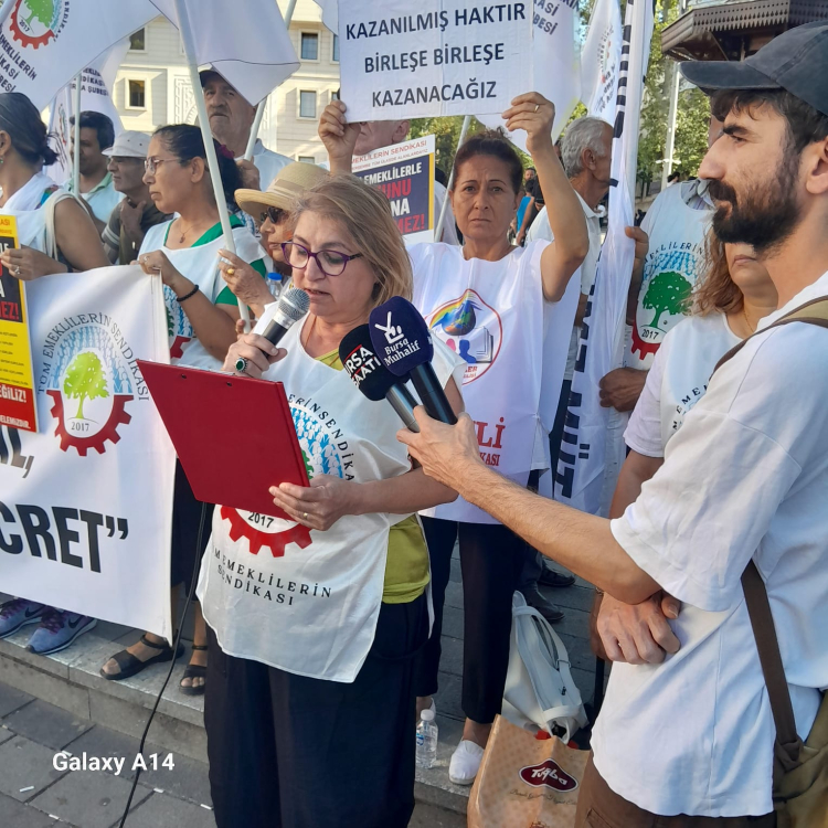 Bursa’da Tüm Emeklilerin Sendikası üyeleri, Fomara Meydanı’nda bir araya gelerek emeklilerin yaşadığı yoksulluğu protesto etti. Sendika, en düşük emekli aylığının memur maaşına eşitlenmesini talep ediyor.