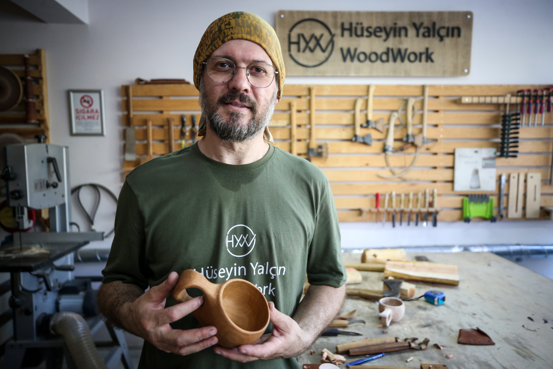 Kendi işinin patronu olmasına rağmen mesleğini 4 yıl önce bıraktığını belirten Yalçın, "Kampta tesadüfen ahşap kaşık oymayla başladı her şey. Ondan sonra yapabildiğimi gördüm. Kaşık oymaya başladım, ardından ahşap bardak oymayla devam ettim. Derken bir anda kendimi ahşap oyma işlerinin içinde buldum ve bu işe tutkuyla bağlandım." dedi.