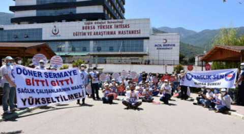 Çok sayıda sağlık personeli ve sendika yetkililerinin katıldığı eylemde, döner sermaye (ek ödeme) sistemi protesto edildi. Sağlık-Sen Bursa Şube Başkanı Gökhan Yünkül'ün basın açıklamasıyla başlayan eylem, oturma eylemi ve sloganlar ile son buldu.