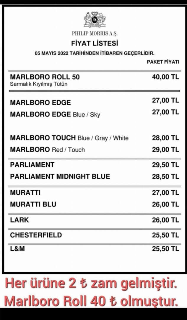 Her ürüne gelen 2 lira zammın ardından en ucuz sigara 25.50 TL, en pahalı sigara ise 40 TL oldu.