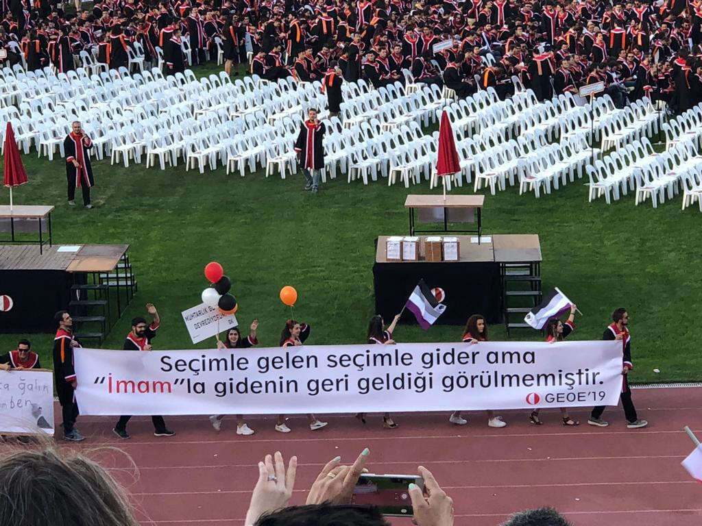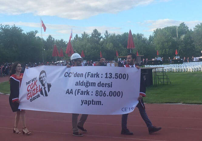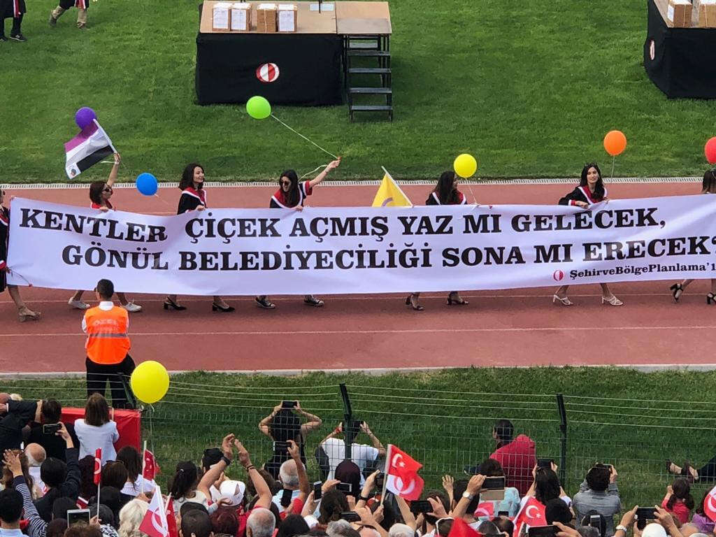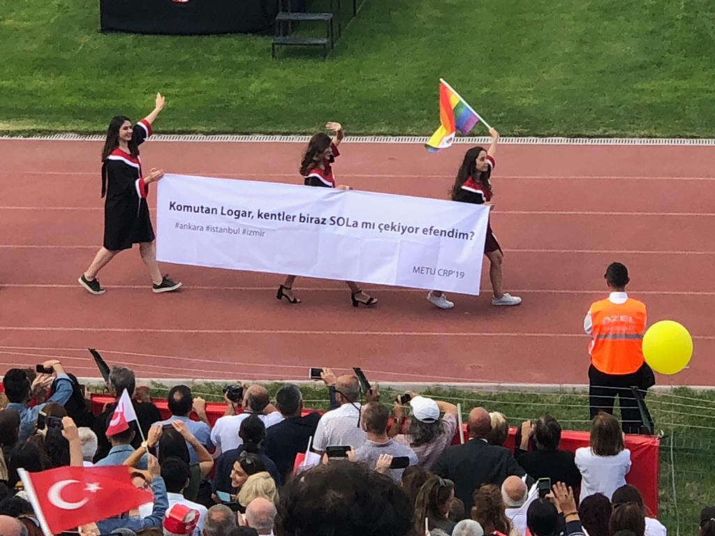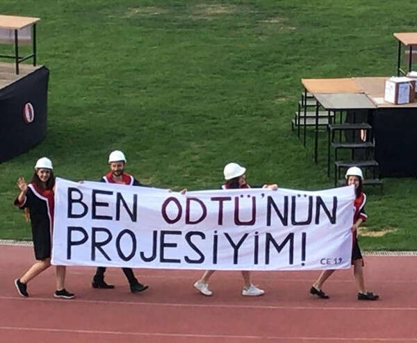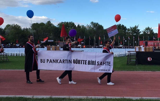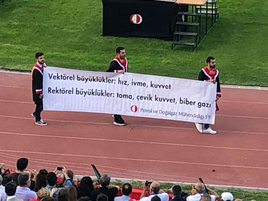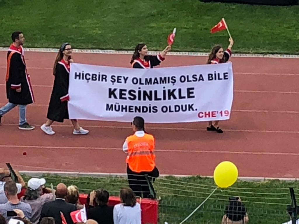 Orta Doğu Teknik Üniversitesi (ODTÜ) öğrencilerinin 2019 mezuniyet törenine bu yıl da hazırladıkları pankartlar damga vurdu. Mezuniyet töreninde İstanbul seçimlerine gönderme yapan pankartlar dikkat çekti.