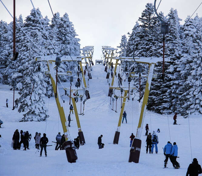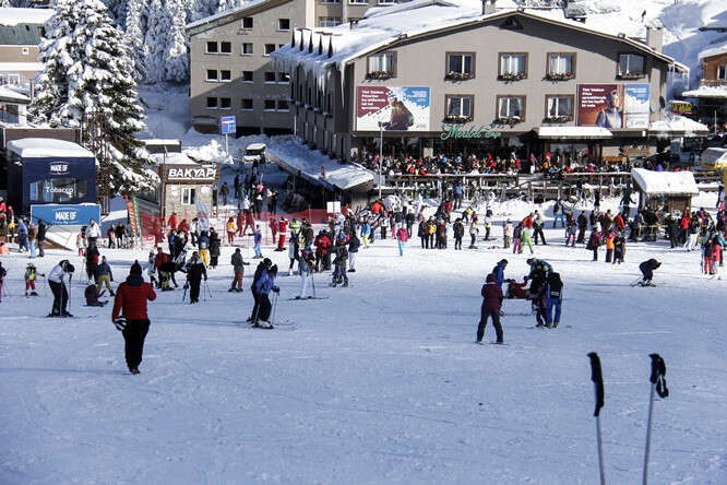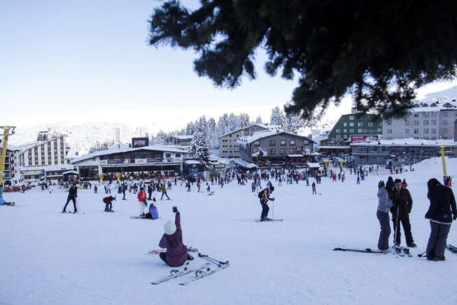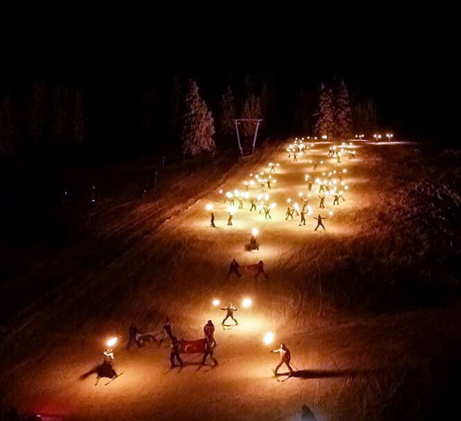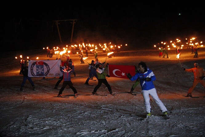 Türkiye'nin önemli kış turizm merkezlerinden Uludağ'da yılbaşı yoğunluğu yaşanıyor. Yeni yıla yüzde 100 dolulukla girecek zirvedeki tesislerde konaklayanların yanı sıra günübirlikçilerin de adeta akın ettiği Uludağ, en kalabalık günlerinden birini geçiriyor. Çeşitli etkinliklerin düzenlendiği Uludağ'da kayak eğitmenleri, gece karanlığında ellerinde meşale, Türk bayrakları ve Atatürk posteriyle kaydı.