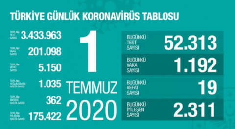 1 Temmuz tablosu; 19 can kaybı, 1192 yeni vaka