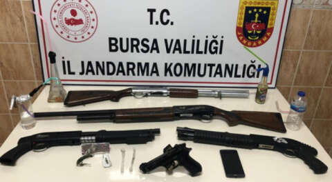 Yapılan aramalarda, 2 pompalı tüfek, 2 otomatik av tüfeği, 1 kurusıkı tabanca, 2 gram esrar, 1 gram sentetik uyuşturucu ve 7 uyuşturucu kullanma aparatı ele geçirildi.