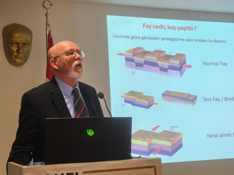 Prof. Dr. Gürol Seyitoğlu, fayın ne olduğu ve çeşitleri hakkında temel bilgi vererek konuşmasına başladı. Kahramanmaraş depremleriyle Bursa'da yaşanılacağını düşündükleri sistem arasında benzerlikler olduğunu söyleyen Seyitoğlu, depremden bir ay sonra uydu verileriyle yüzey kırıklarının oluşturduğu haritalamayı göstererek, "Burada ilk depremin merkezinin bulunduğu yer. 7,8 büyüklüğünde deprem var. Yüzey yırtılmasıyla oluşan fayın izi bir havzabiçen fay yarattı. Havzabiçen fayın önemi, örtünün altında olduğu için o zamana kadar fark edilmesi oldukça zor. Bu diri fay haritalarında gösterilmiyor. Deprem olduğu zaman yüzey yırtılmasıyla kendisini ortaya koyuyor. Biz o zaman anlayabiliyoruz burada bir fay olduğunu" dedi.