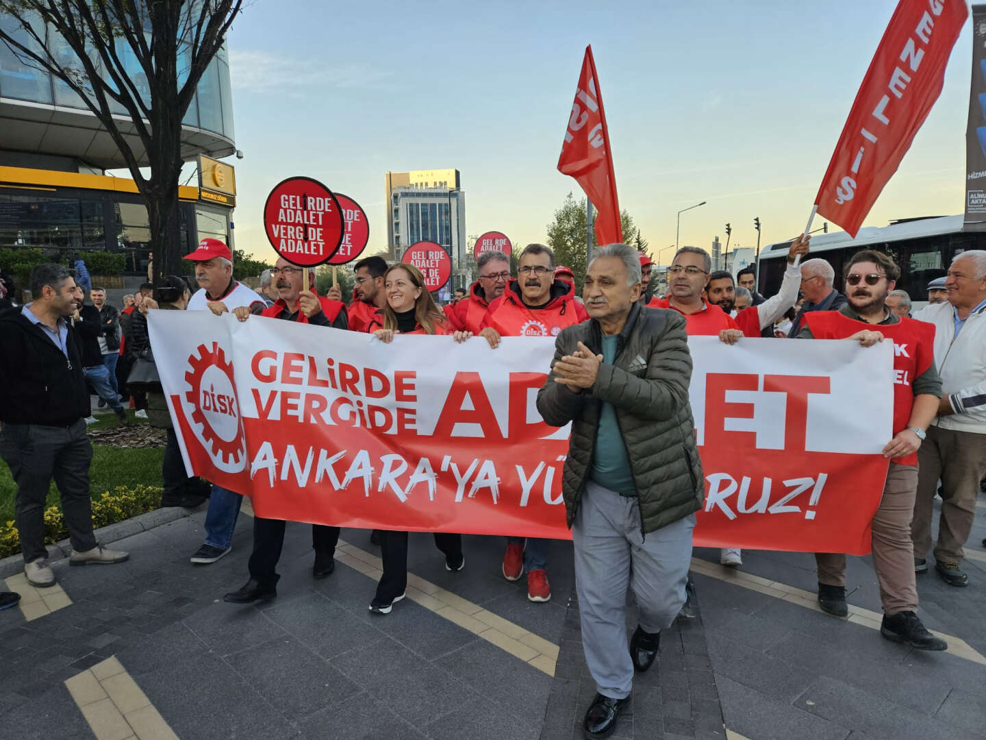 DİSK üyeleri, "Vergide adalet istiyoruz", "Ankara duy sesimizi, bu gelen işçinin ayak sesleri", "Yaşasın sınıf dayanışması" sloganları attı.