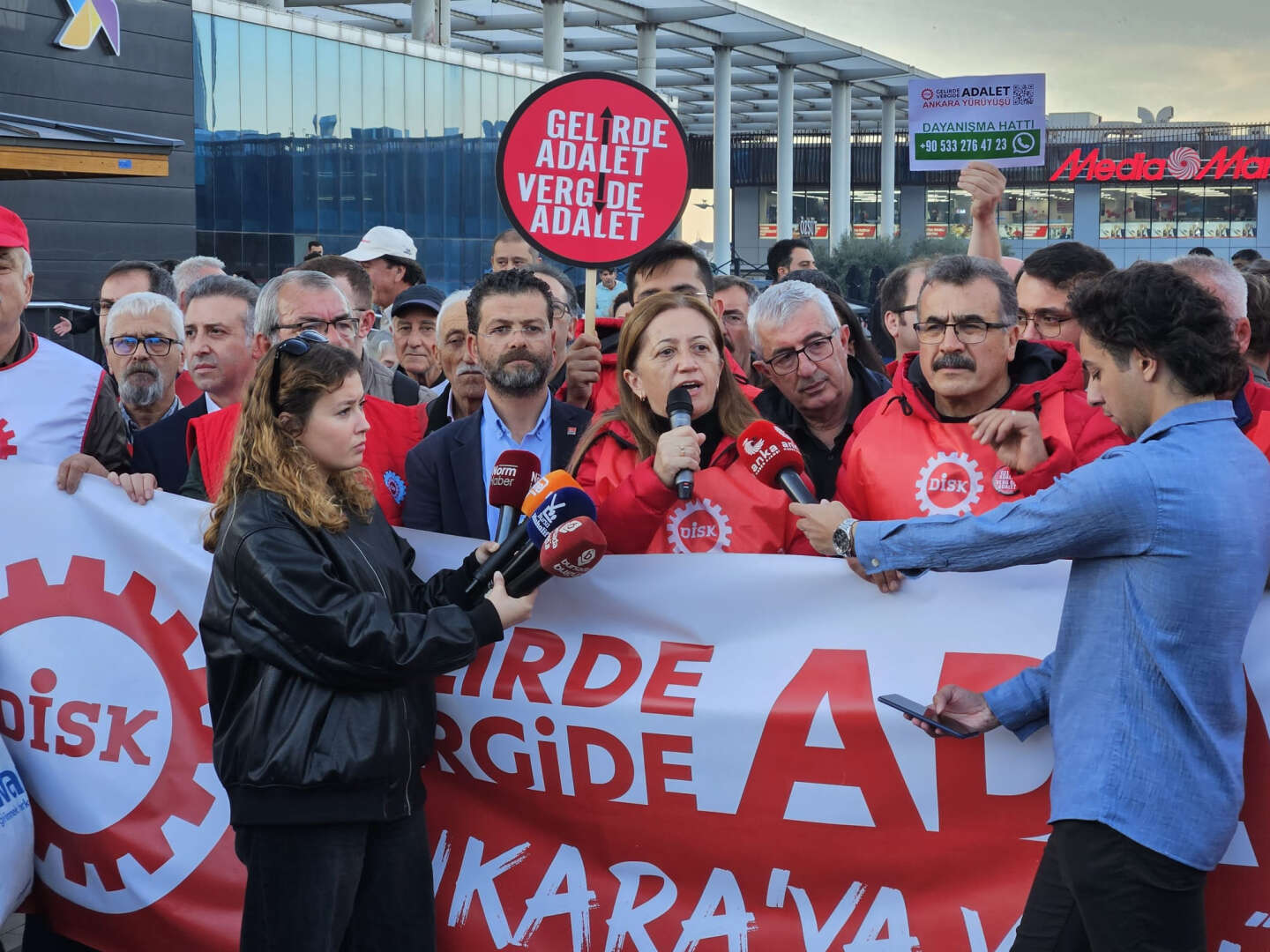 "Düzenin bütün çarklarının zengini daha zengin, yoksulu daha yoksul yapmak üzerine döndüğünü" belirten Çerkezoğlu, "Düzenin bütün çarkları yoksuldan alıp zengine vermek için dönüyor. Hepimizi açlığa mahkum eden bu düzeni değiştirmek için yürüyoruz. Dünyanın en adaletsiz vergi sistemi Türkiye'de. İşçinin de patronun da bir kilo domates aldığı zaman ödediği verginin aynı oranda olduğu, o nedenle de adaletsiz olan vergiler, devletin vergi gelirlerinin 4'te 3'üne ulaştı. Bizler daha ücretimizi almadan peşin peşin gelir vergisi ödüyoruz. Vergi dilimleri bilerek düşük belirlendiği için hemen sanki zengin olmuşuz gibi vergi dilimine giriyoruz" ifadelerini kullandı.