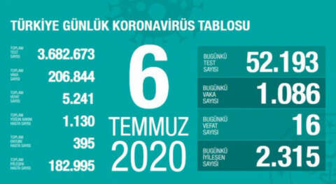 Sağlık Bakanlığının internet sitesinde yer alan ve Bakan Fahrettin Koca'nın Twitter'dan paylaştığı "Türkiye Günlük Koronavirüs Tablosu"nun güncel verilerine göre, bugün 52 bin 193 test yapıldı, 1086 kişiye Kovid-19 tanısı konuldu. Son 24 saatte 16 hasta vefat etti, 2 bin 315 kişi iyileşti.