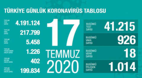 Türkiye'de son 24 saatte 926 kişiye Kovid-19 tanısı konuldu, 18 kişi hayatını kaybetti, toplam vaka sayısı 217 bin 799, can kaybı 5 bin 458 oldu. Bakan Koca, "Son 35 günde en düşük vefat sayımız 13 Haziran'da, 14 olarak gerçekleşmişti" dedi.