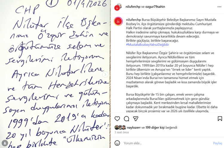 Cumhuriyet Halk Partisi Nilüfer İlçe Örgütü, Bursa Büyükşehir Belediye Başkanı Mustafa Bozbey'in ilçe örgütüne gönderdiği mektubu vatandaşlarla paylaştı. Bozbey, "22 yıl fiili belediye başkanlığı yapan bir Bursalı, Bursa sevdalısı olarak verilmeyecek hesabımız yok ve de 22 yıl boyunca Bursalı’nın kör kuruşunu zayi etmedik, ettirmedik. Çünkü biliyoruz ki tüyü bitmemiş yetimin hakkını korumak ahlak ve fazilet gerektirir." dedi.
