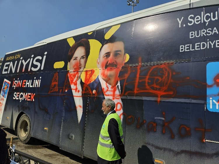 Bursa'da İYİ Parti ve AK Parti arasında afiş gerilimi sürüyor. İYİ Parti Adayı Selçuk Türkoğlu, Cumhur İttifakı Bursa Büyükşehir Belediye Başkan Adayı Alinur Aktaş'ın afişlerini sprey boyayla boyamıştı. Ardından Türkoğlu'nun seçim otobüsü spreyle boyandı.