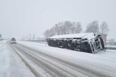 Karacabey ilçesi Uluabat mevkiinde de yoğun kar yağışı sebebiyle Bursa - İzmir Yolunun bir bölümü karla kaplanınca Bursa istikametinden Karacabey istikametine seyreden 20 AHS 587 plakalı tır karda kayıp orta refüje düştü. Yan yatan tırın sürücüsü kazadan yara almadan kurtuldu.