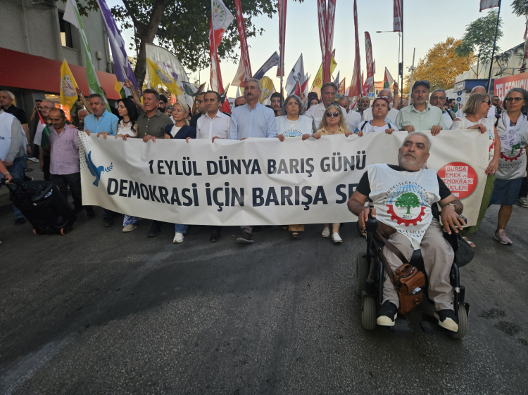 1 Eylül Dünya Barış Günü'nde Bursa'da düzenlenen yürüyüşe CHP İl Başkanı, milletvekilleri ve sivil toplum kuruluşları katıldı. Katılımcılar, Kent Meydanı'ndan Millet Bahçesi'ne "Barış Hemen Şimdi" sloganları eşliğinde yürüdü.