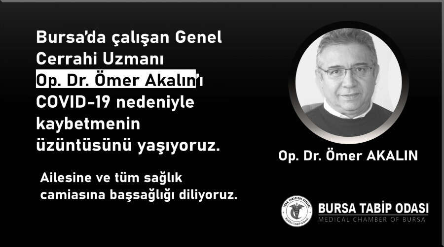 Bursa Tabip Odası'nın (BTO), sosyal medya hesabından yapılan açıklamada, Bursa'da görevli Genel Cerrahi Uzmanı Op. Dr. Ömer Akalın'ın, özel bir hastanenin yoğun bakım servisinde koronavirüs nedeniyle tedavi altındayken hayatını kaybettiği bildirildi.