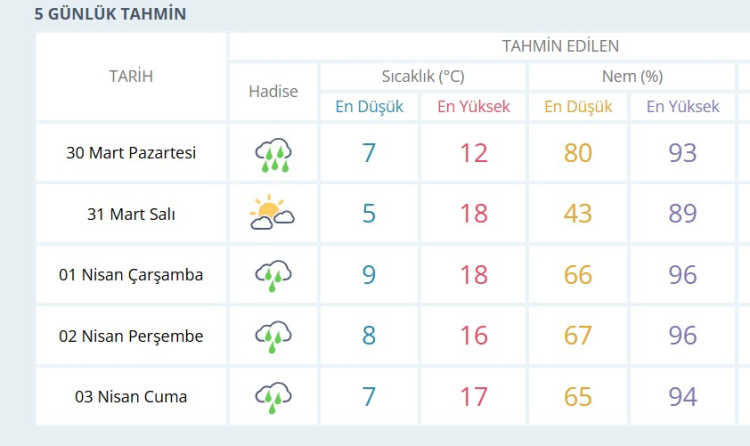 Meteoroloji verilerine göre, önümüzdeki 5 gün boyunca, salı günü hariç, kent genelinde yağış görülecek.