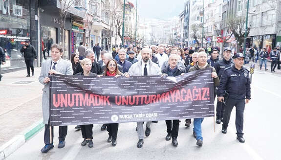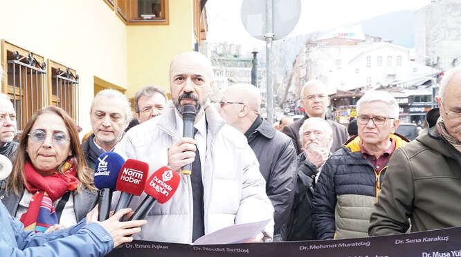 Bursa Tabip Odası, 14 Mart Tıp Bayramı'nda basın açıklaması, yürüyüş ve çelenk bırakma töreni gerçekleştirdi. Başkan Dr. Levent Tufan Kumaş, depremin büyük bir afetle sonuçlanmasının, tüm akademik alanlardaki mesleki ve bilimsel uyarılara kulak tıkayan, hukuku hiçe sayan ve eleştiriye tahammülü olmayan bir yönetim anlayışından kaynaklandığı söyledi.
