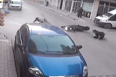 Çevrede bulunan bir iş yerinin güvenlik kamerasının kaydettiği görüntülerde iki motosikletin çarpışma anı ve çevredekilerin yardıma koşmaları dikkat çekiyor.