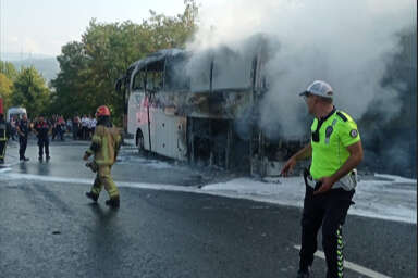 Bursa’nın Kestel ilçesinde aracın motor kısmındaki yangını fark edince otobüsü hemen yol kenarına çekerek yolcuları tahliye eden şoför büyük bir faciayı önledi.