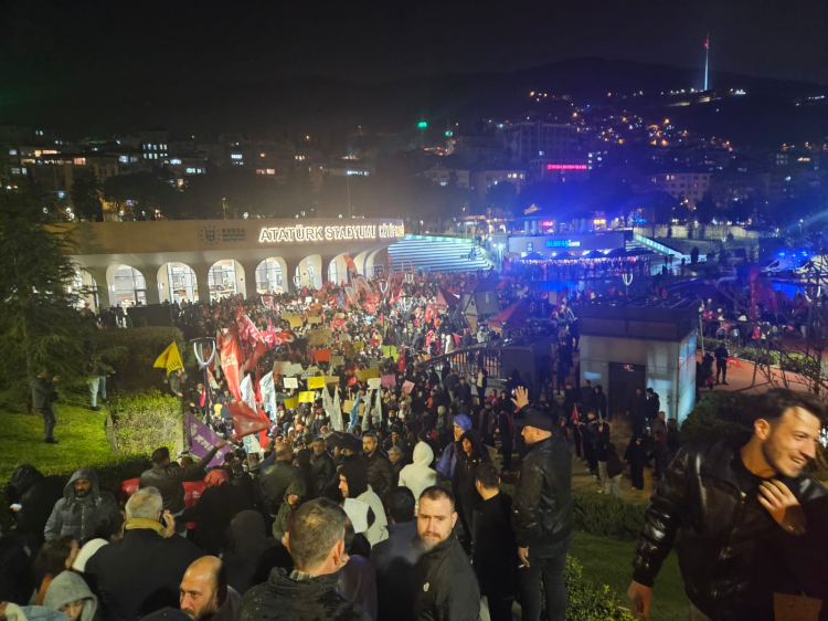 İstanbul Büyükşehir Belediye Başkanı Ekrem İmamoğlu'nun 19 Mart'ta gözaltına alınmasıyla başlayan protestolar devam ediyor. Bugün İmamoğlu hakkında başlatılan iki soruşturmadan birinde tutuklama kararı çıktı. İmamoğlu'nun tutuklanmasıyla Cumhuriyet Halk Partisi Bursa İl Başkanlığı öncülüğünde, bu akşam Atatürk Stadyumu Kütüphanesi'nde saat 20.00'da toplanma kararı alındı. Belirtilen saatte çok sayıda parti temsilcileri, Bursa Tabip Odası, sivil toplum kuruluşları, üniversite öğrencileri, vatandaşlar Atatürk Stadyumu Kütüphanesi önünde bir araya geldi.