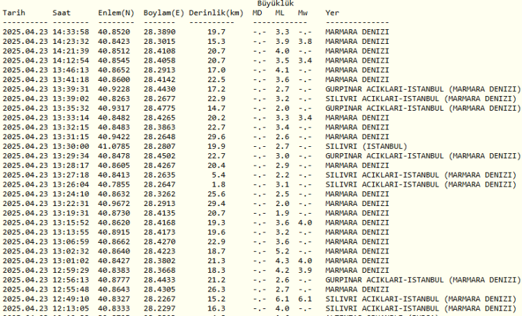 Kandilli Rasathanesi'nin kayıtlarına göre Marmara Denizi'nde bugün meydana gelen depremler şöyle:
