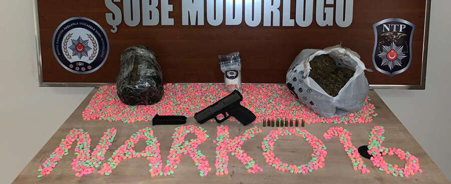 Zanlılara ait ev ve araçlarda yapılan aramalarda 7 bin uyuşturucu tablet, 1 kilo 770 gram esrar ve bir ruhsatsız tabanca ele geçirildi.