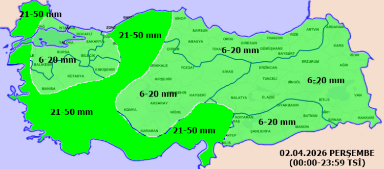 2 Nisan Perşembe günü ise yağışlar daha geniş alana yayılıyor. Bursa’da 6-20 mm yağış öngörülürken, Marmara ve Ege genelinde birçok bölgede 21-50 mm aralığında kuvvetli yağış bekleniyor.