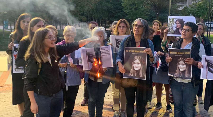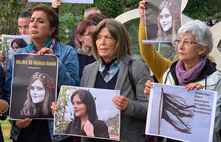 Mahsa Amini’nin fotoğrafları, çeşitli sloganlar ile İran'da kadınların eylemlerinin simgesi olan bayraklaşmış saç dövizi taşıyan kadınlar, cinayetin ardından İran'da sokaklara çıkan kadınların yanında olduklarını dile getirdiler.