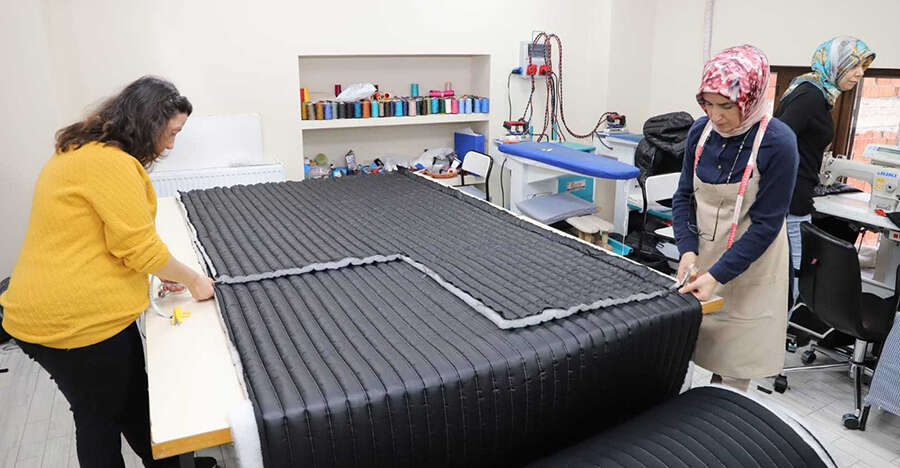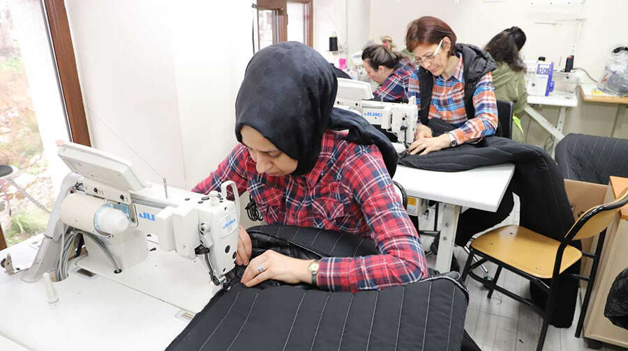 Bursa Olgunlaşma Enstitüsünde çalışan usta öğretici ve kursiyerler, depremden etkilenen vatandaşlar için kıyafet, battaniye gibi ihtiyaç malzemeleriyle başladıkları üretimi uyku tulumuyla sürdürüyor.
